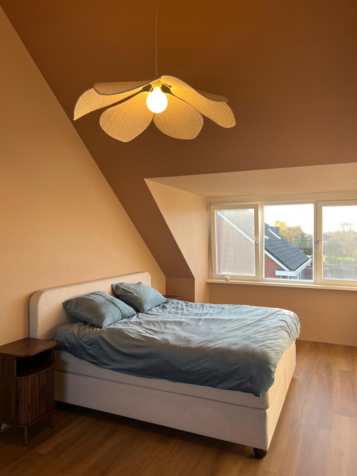 Voor deze slaapkamer kozen we voor diepe terracotta kleuren, die direct warmte en gezelligheid toevoegen. Zelfs het gehele schuine dak werd meegeschilderd. Een spannende keuze, maar het resultaat is verbluffend mooi en sfeervol. Dankzij de hoge plafonds en de grote dakramen blijft de kamer licht en luchtig, ondanks de rijke kleuren.